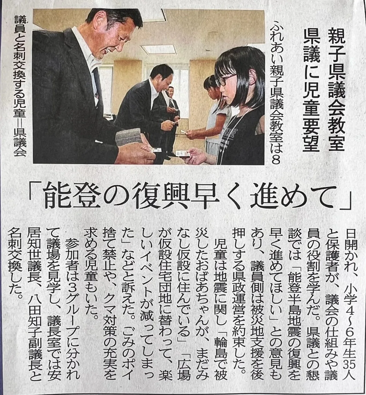 8月8日、親子県議会教室が開催され、35名の小学生に参加していただきました。平蔵県議、太田県議、小松県議とともに、県議会の役割や地域の課題について説明しました。