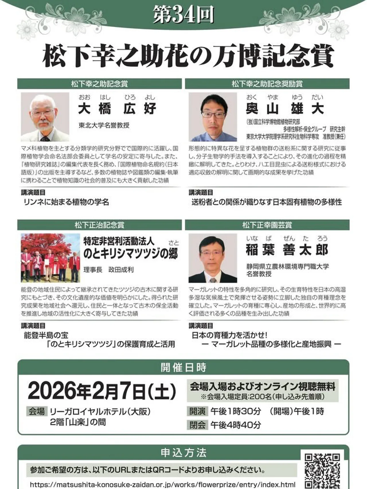 このたび、松下幸之助記念志財団が発表した第34回「松下幸之助花の万博記念賞」において、石川県能登町のNPO法人「のとキリシマツツジの郷」が「松下正治記念賞」を受賞されました。