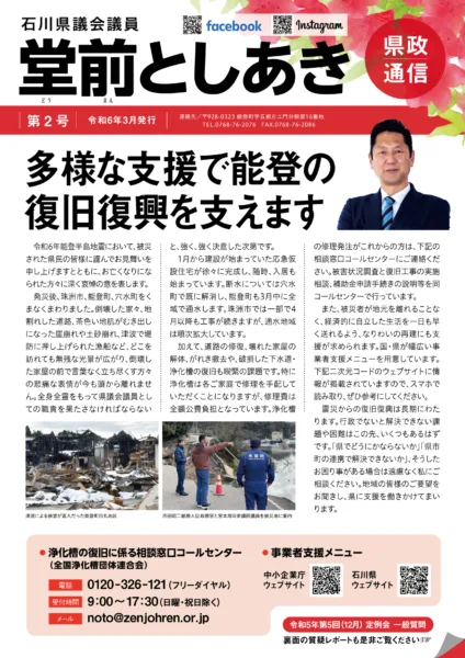 堂前としあき県政通信(第2号)を発行いたしました。 是非ご一読いただけますと幸いです。